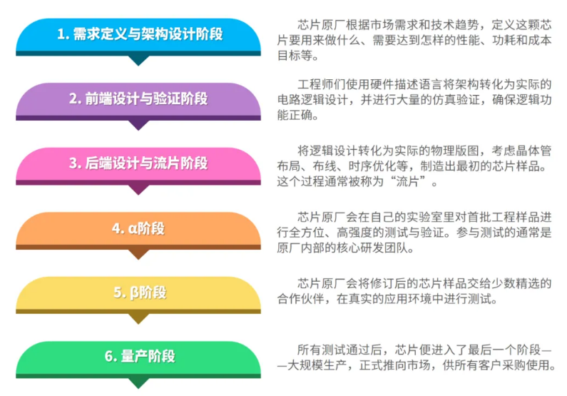 一颗芯片的研发历程相当复杂,它大致会经历以下6个关键阶段:需求定义与架构设计阶段、前端设计与验证、后端设计与流片、α阶段、β阶段和量产阶段。