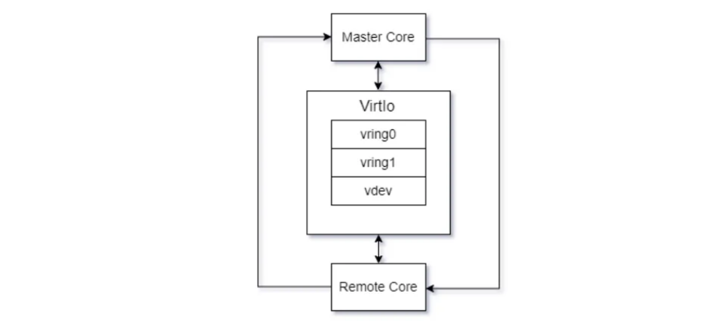 Virtio提供了共享内存管理与虚拟设备支持,其核心是成对的vring(环形缓冲区),分别用于发送和接收消息。这两个vring共同构成一个环形队列,vring缓冲区即为处理器间的共享内存区域。当共享内存中有新消息到达时,mailbox框架会通知相应处理器进行接收处理。