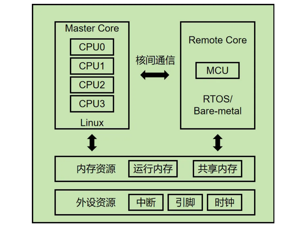 飞凌嵌入式T153核心板支持AP+MCU模式的实时方案。AP+MCU系统架构为Linux+MCU RTOS/Bare-metal。运行LinuxAP处理器核心作为主核(Master Core);运行RTOS/Bare-metal的MCU处理器核心作为从核(Remote Core)。主核负责整个多核异构系统中共享资源的划分和管理,并运行主站服务程序。