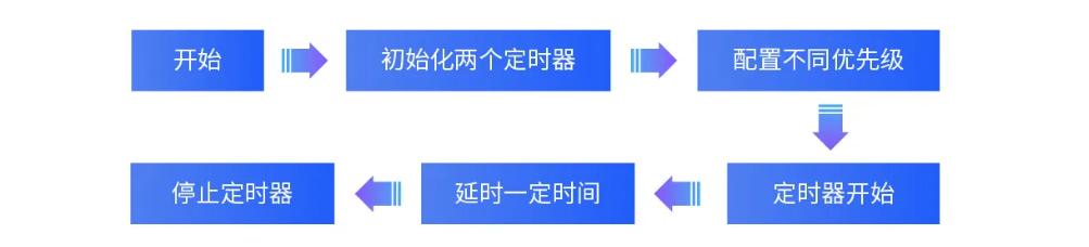 测试方法:配置两个不同优先级的定时器,低优先级定时器(timer3)定时1s,回调中延迟900ms,以此达到延迟退出中断的时间。高优先级定时器(timer2)定时100ms,中断回调中不加延时。