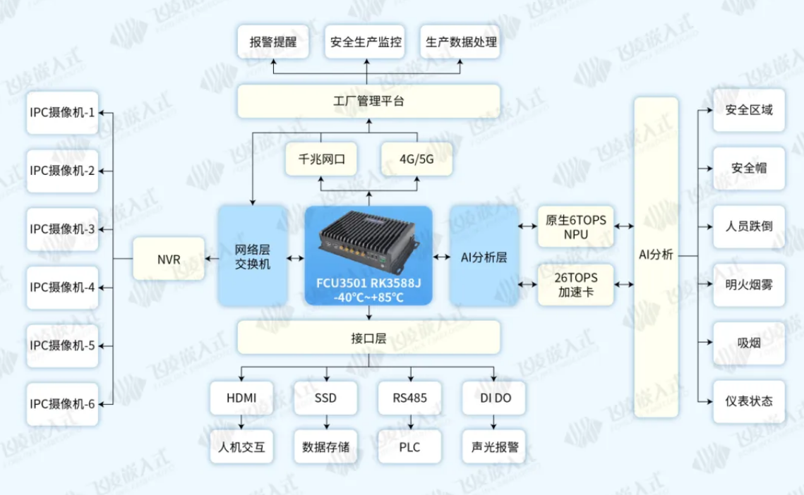 AI边缘计算盒子FCU3501 |FCU3501 是飞凌嵌入式推出的高性能工业级AI边缘计算盒子,基于瑞芯微旗舰处理器 RK3588J 打造,集成 4×Cortex-A76 + 4×Cortex-A55 八核CPU 与 6 TOPS NPU,是一款专为复杂场景设计的智能8K编解视觉分析智能盒。AI边缘计算盒子支持16路1080P视频并发接入与AI推理,广泛应用于智慧交通、智能制造、能源巡检等边缘计算领域。